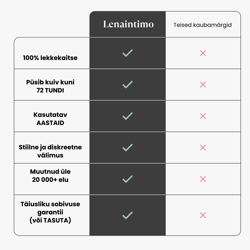 Disainisime Lenaintimo nii, et see ületaks tavalise lekkekindla pesu mugavuse, kaitse ja enesekindluse poolest. Siin on meie võrdlus.